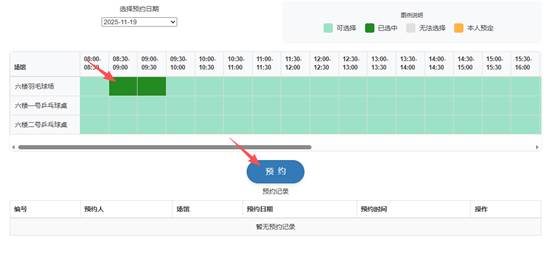 进入预约系统,可以去接单击运动场地对应的时间块(注意:预约最多只能选连续的2 个小时,主要考虑老师们实际的运动量,如想运动长可以请伙伴一起预约下个时间块)